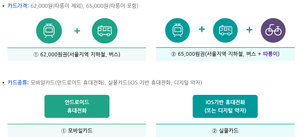 이용범위: 서울지역 지하철, 서울시 면허 시내·마을버스, 따릉이