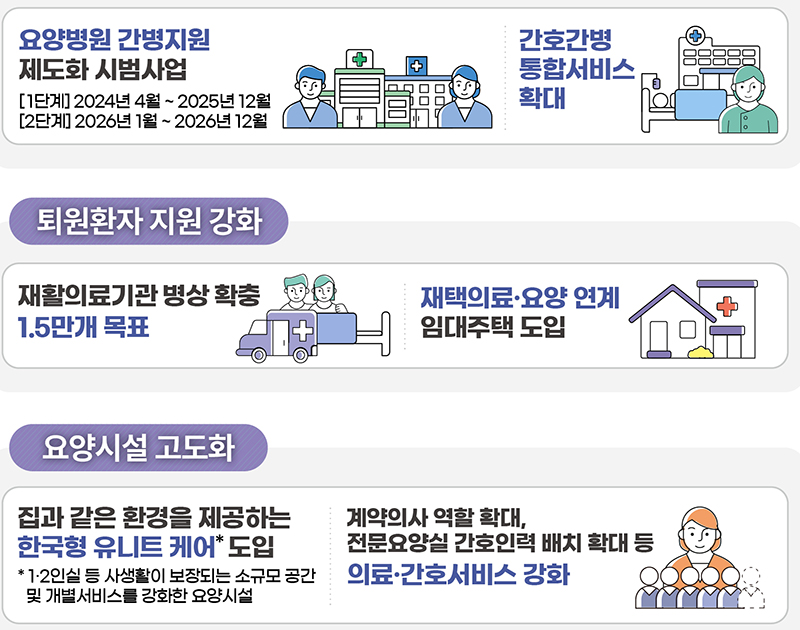 간호·간병 통합서비스도 확대하는데, 우선 올 7월부터 중증·치매환자 전담병실 도입 및 간호인력 배치 확대 등을 추진한다.