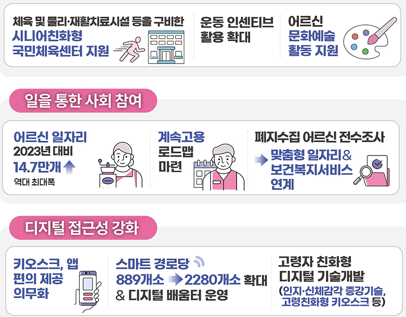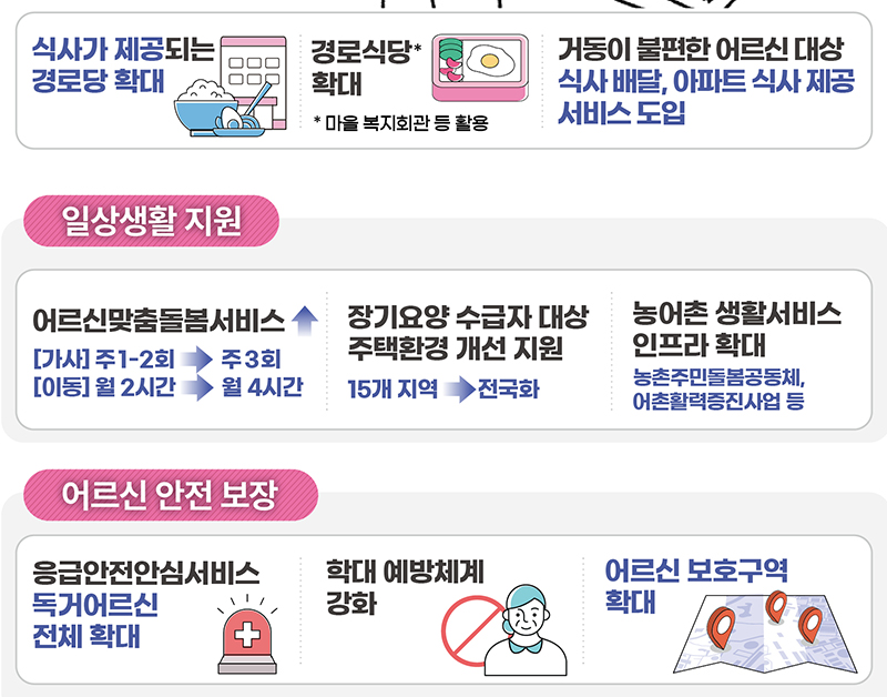 또한 노인맞춤돌봄서비스 확대와 고령층 주거환경 개선 등 일상생활을 지원한다.
