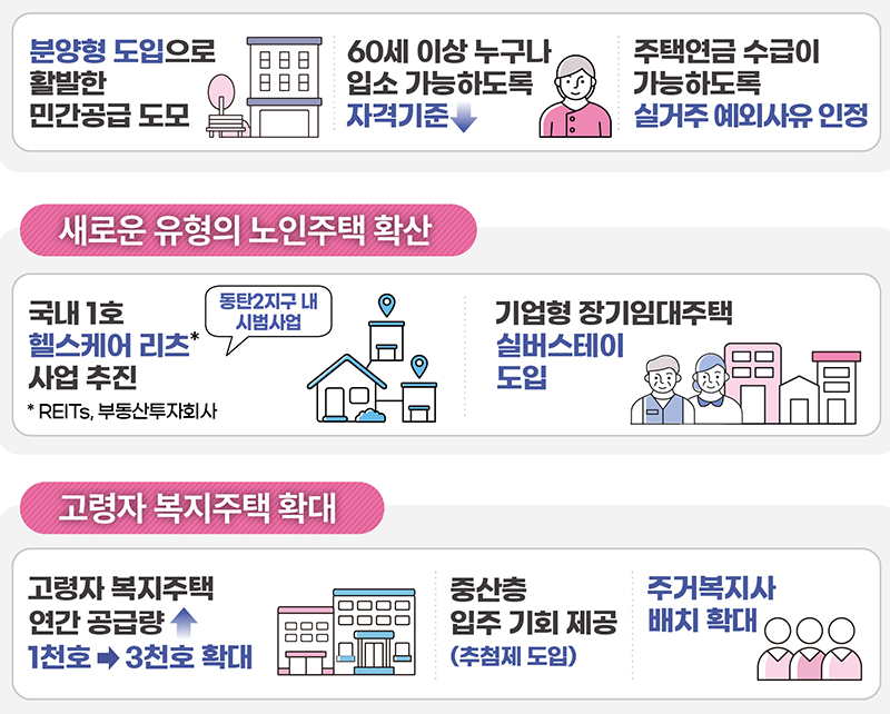 정부는 분양형 주택 재도입, 입주자격 및 위탁운여 등 관련 제도 개선을 통해 실버타운(노인복지주택) 활성화를 추진한다.