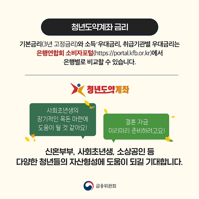 - 신용·자산관리 컨설팅 서비스를 연계 제공하여 청년의 사회 첫 출발을 지원하고 있습니다.