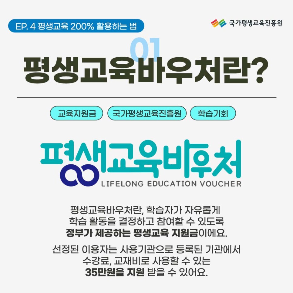 1인당 평생교육바우처 사용 등록된 기관의 수강료, 해당 강좌의 교재비로 사용할 수 있는 35만원을 지원하고 있습니다.