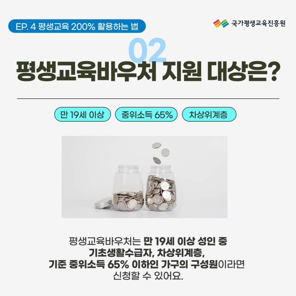 기준 중위소득 65% 이하인 가구원 단, 평생교육바우처 사용기간 내에 한국장학재단 국가장학금을 지급받을 경우 평생교육바우처 신청이 불가하니, 참고해 주세요!