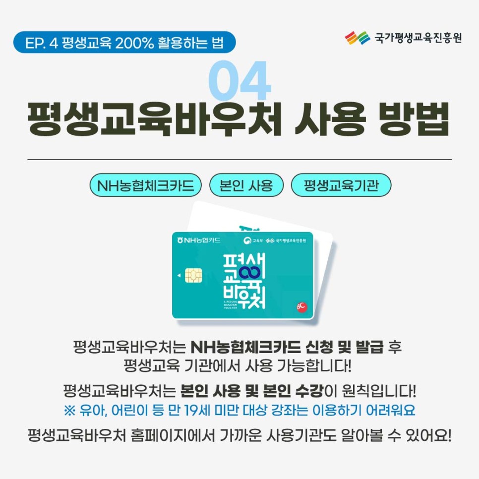 사용 방법은 NH농협체크카드를 신청하여 등록된 교육 기관에서 직접 결제하거나, 온라인으로 결제할 수 있습니다. 추가 비용이 발생할 경우에는 본인이 부담하여야 하며, 사용은 해당 연도 개설된 강좌에 한해 가능합니다. 평생교육바우처 홈페이지에서 이용 가능한 기관을 확인할 수 있습니다.