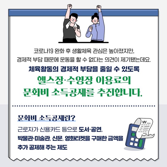 “헬스장, 수영장 이용료의 문화비 소득공제를 추진합니다.”